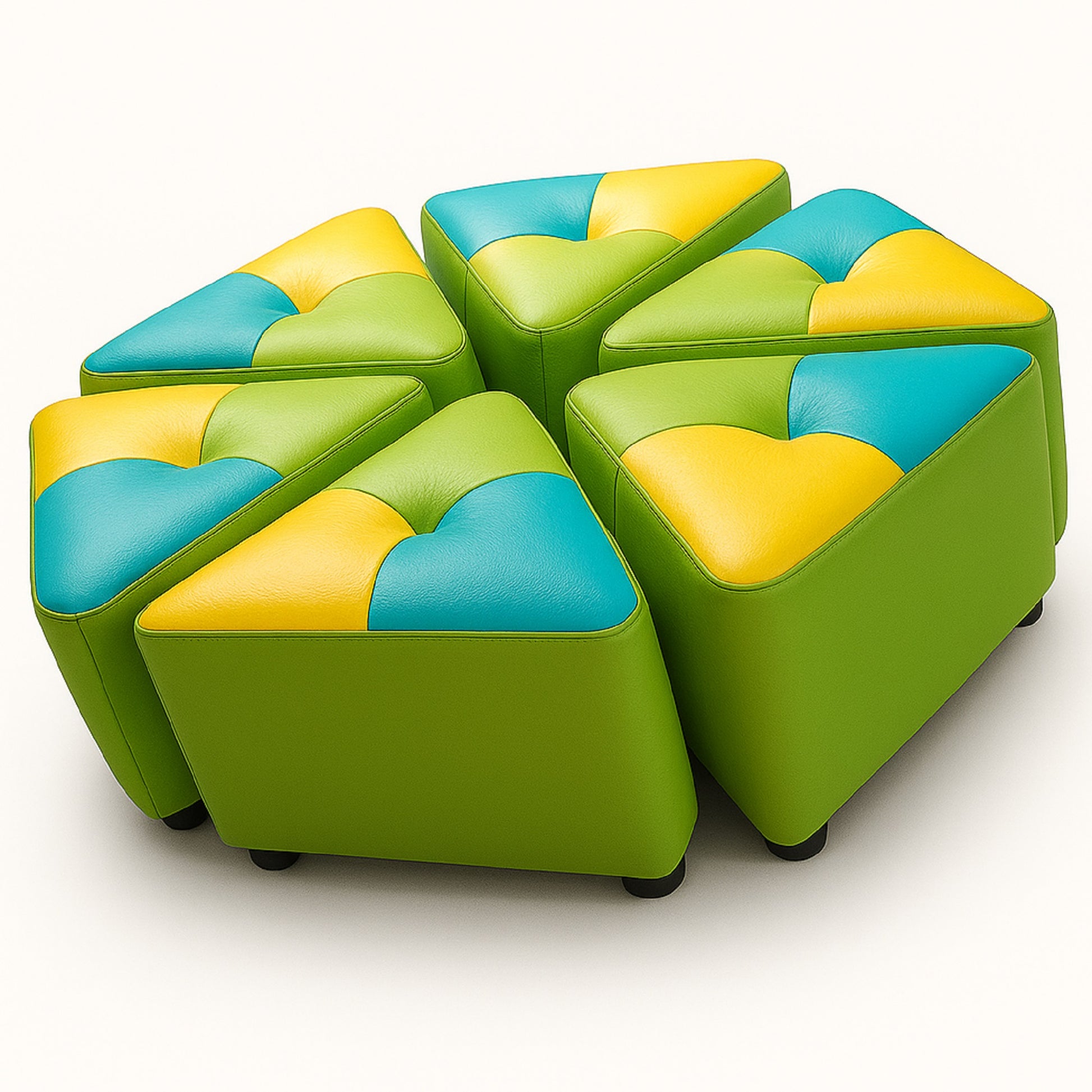 seis puff triangulares para formar figuras, ideal para un salon de Juegos, donde los niños pueden jugar y disfrutar.