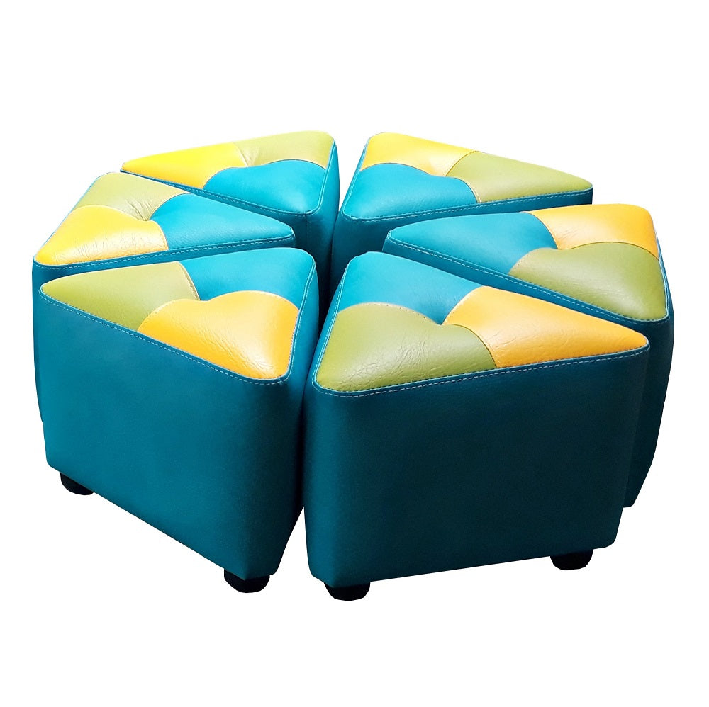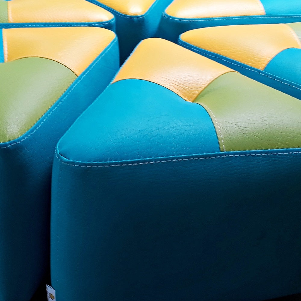 - Set de 6 puffs triangulares que se combinan para crear infinitas figuras y configuraciones